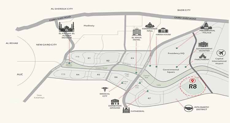 يقع ريزيدنس ايدت العاصمة الإدارية الجديدة في منطقة R8 ، بالقرب من النهر الأخضر ، والنادي المفتوح ، والسنترال بارك ، والحي الدبلوماسي. كما يفصلها عن الحي الدبلوماسي شارع رئيسي بحوالي 70 مترًا ، بالإضافة إلى أنها تبعد حوالي 200 متر عن الجامعة الدولية وبالقرب من منطقة الخدمات التجارية والإدارية. يقع أيضًا أمام كمبوند دايموند سيتي.