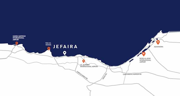 Jefaira is located on the North Coast, in the Ras El Hekma Bay area, at kilo 200 Alexandria-Matrouh Road, 20 km from El Dabaa Road, and 100 km from Marsa Matrouh. It is about 300 km from Cairo and 200 km from Alexandria. It is 65 km away from Marassi North Coast Village, La Vista North Coast Village, and Mountain View Ras El Hekma.