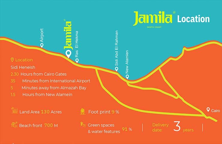 Jamila North Coast Village is a new coastal destination that is located in the beautiful area of Sidi Heneish. The units are designed in modern styles and provide breathtaking views of the Mediterranean Sea. The design is created by the most professional experts in the field of real estate to provide the best experience. Jamila North Coast Sidi Heneish has gone the extra mile to create an environment that nurtures the well-being of its residents. This happens through the green areas that provide peace and comfort, and water features that are strategically placed throughout the resort. These elements create a beautiful atmosphere with positive energy and relaxation. All these features make Jamila a project worth considering when buying your dream coastal home.